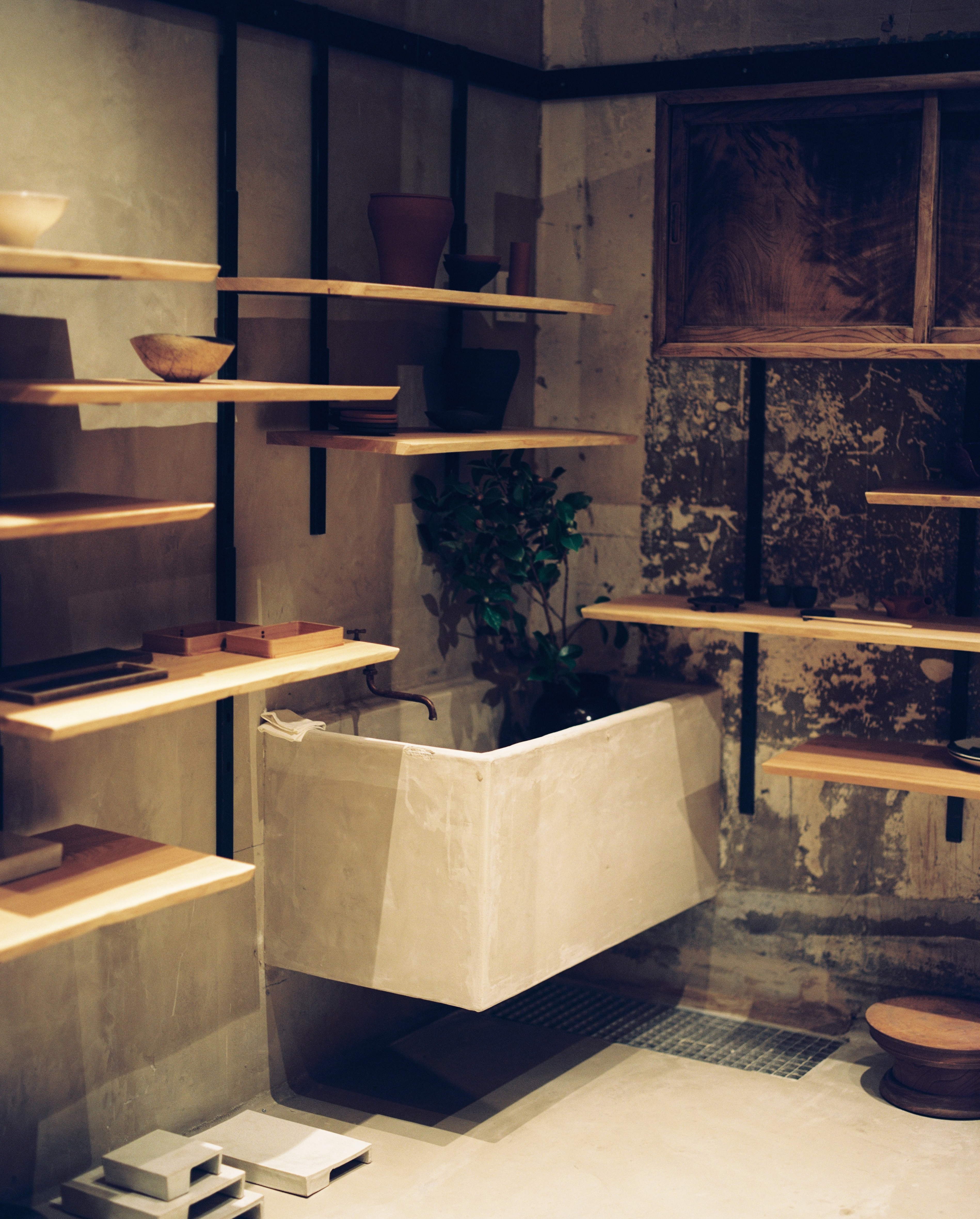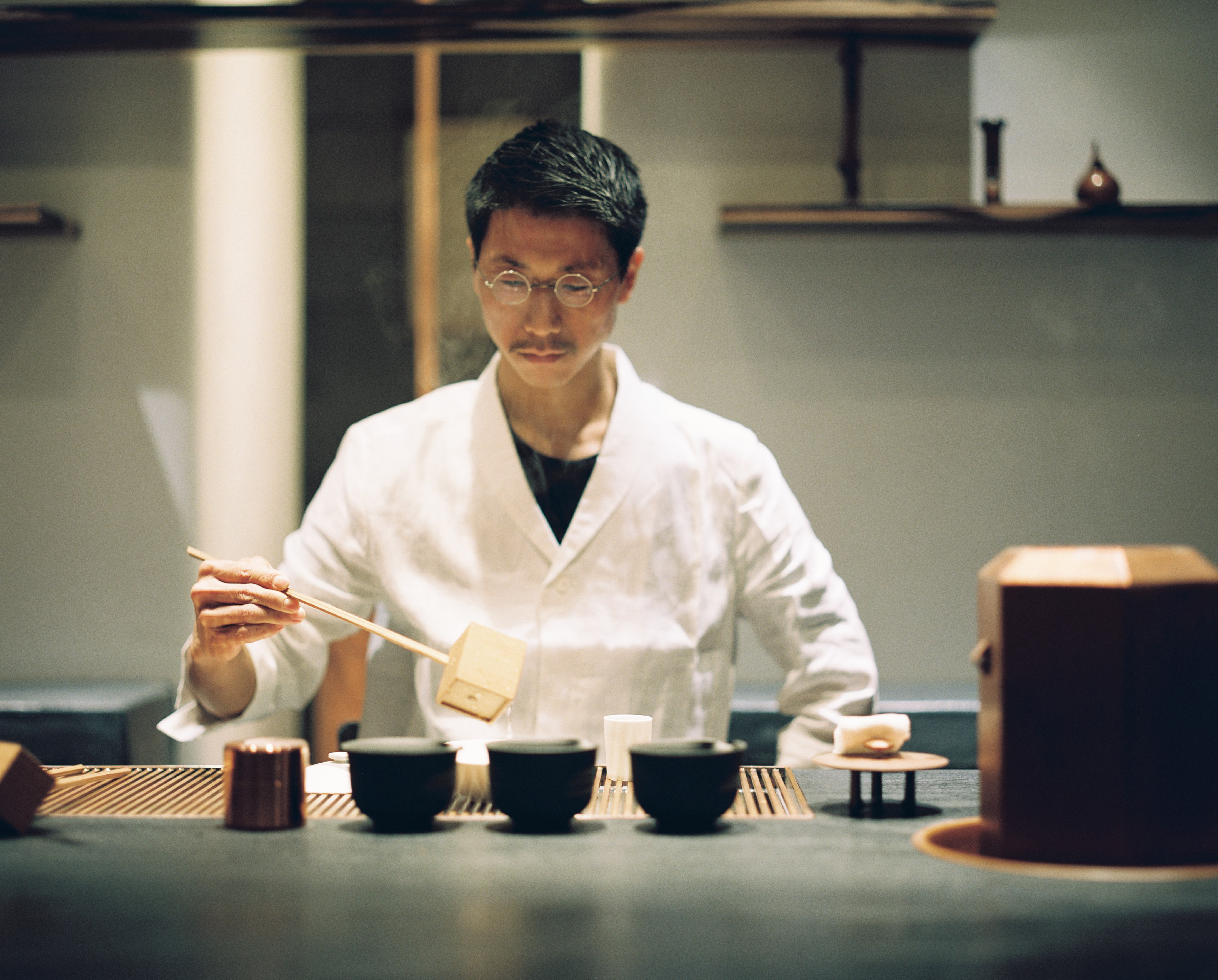 Pour entrer dans l’univers de Shinichiro Ogata, il faut d’abord trouver la porte. Ce qui n’est pas chose évidente, tant ce Japonais, restaurateur passionné de thé et designer d’intérieurs et d’objets, a le don de s’effacer derrière ses créations, et d’en dissimuler savamment les accès. Une façon de faire typiquement japonaise, se laisser découvrir plutôt que se donner à voir de manière ostentatoire. D’ailleurs, ce n’est sûrement pas un hasard s’il a choisi l’une des ruelles les plus discrètes et sinueuses de Paris, la rue Debelleyme dans le haut Marais, pour installer sa première adresse hors de l’archipel nippon. Une fois déniché au détour de la rue Vieille du Temple, le lieu se révèle magistral, baignant dans une quiétude faite de contrastes et de géométries subtiles, jouant sur les lumières et les ombres, le yin et le yang, les hauteurs et les longueurs, les déclinaisons de gris pierre et de bois sombre...”