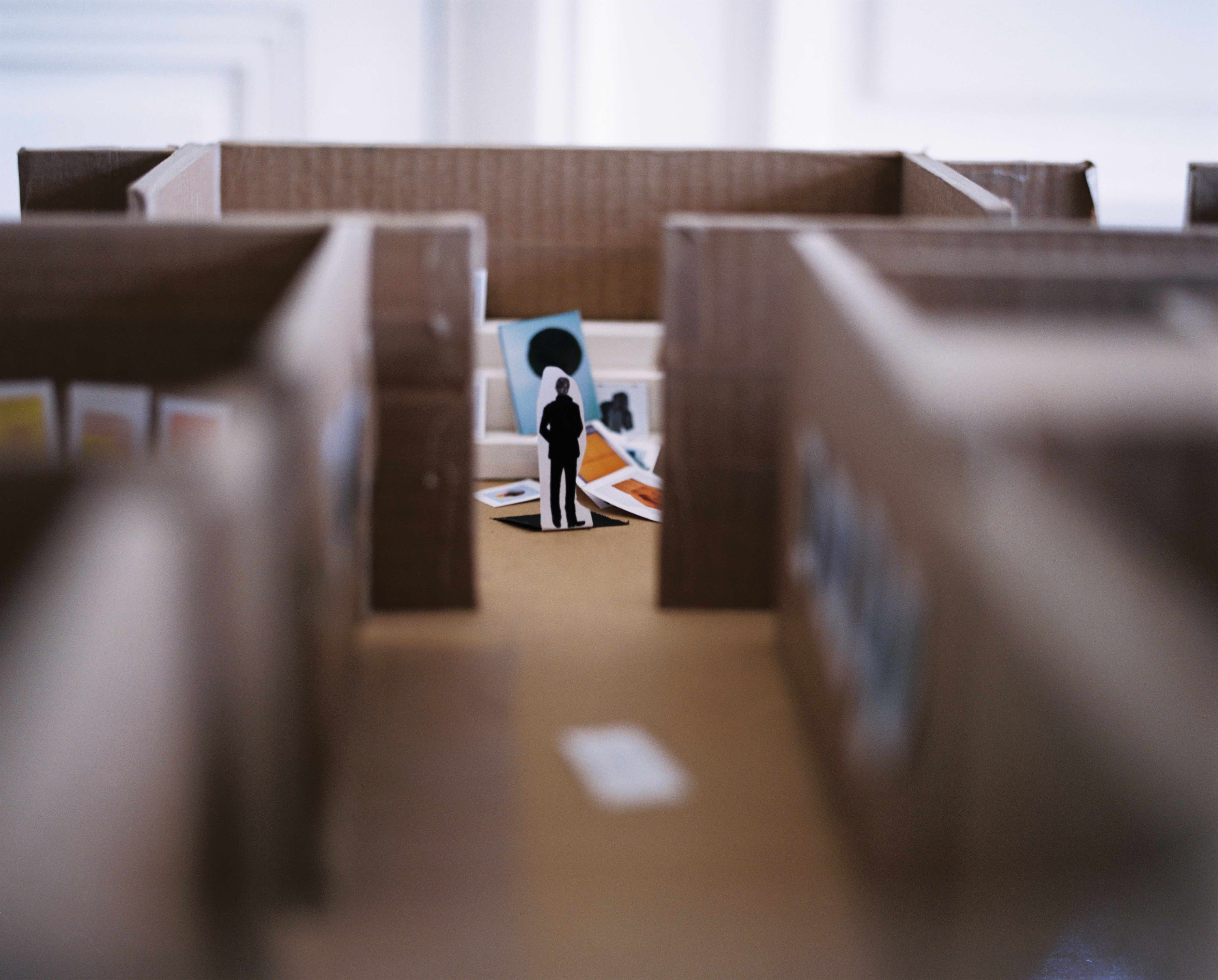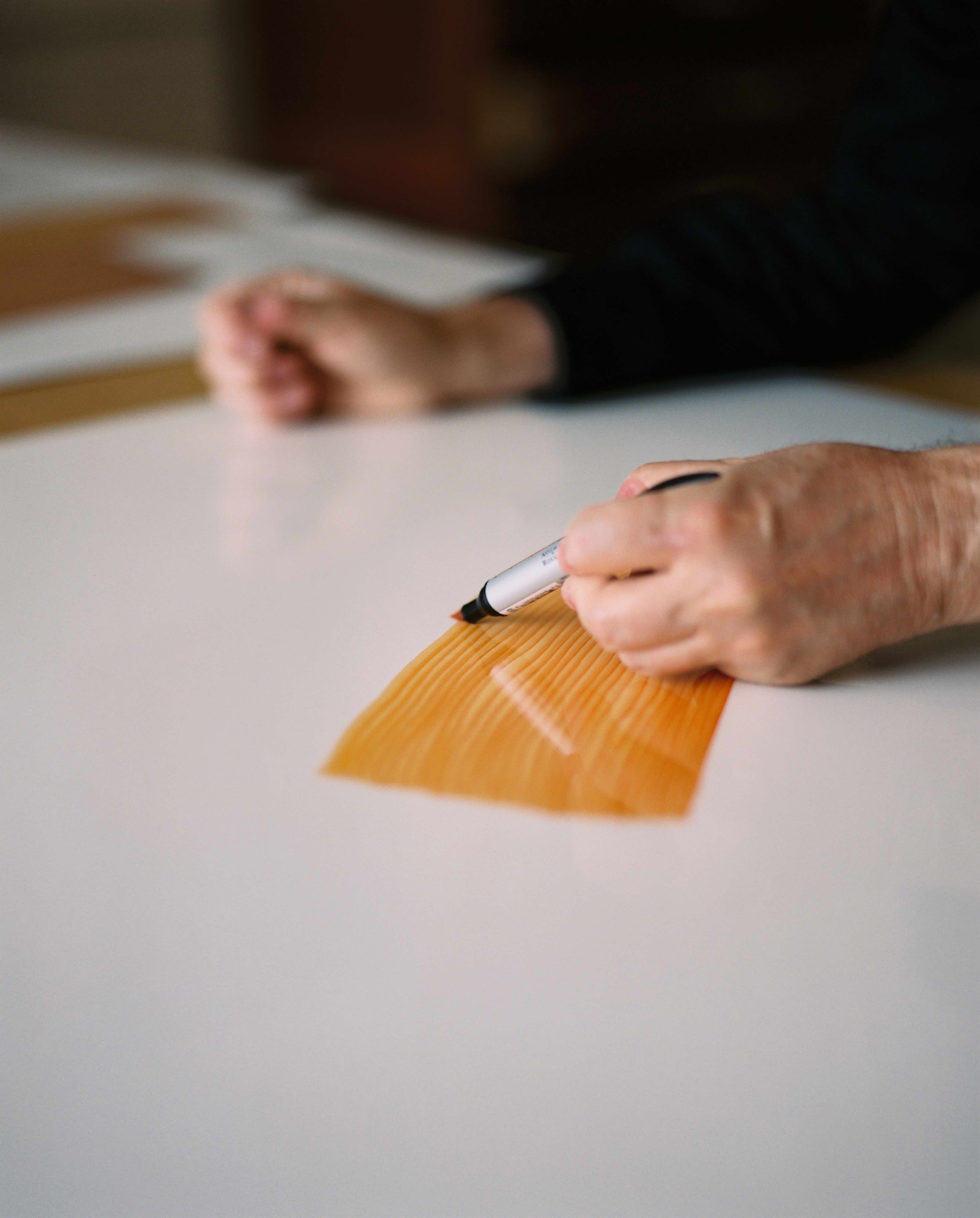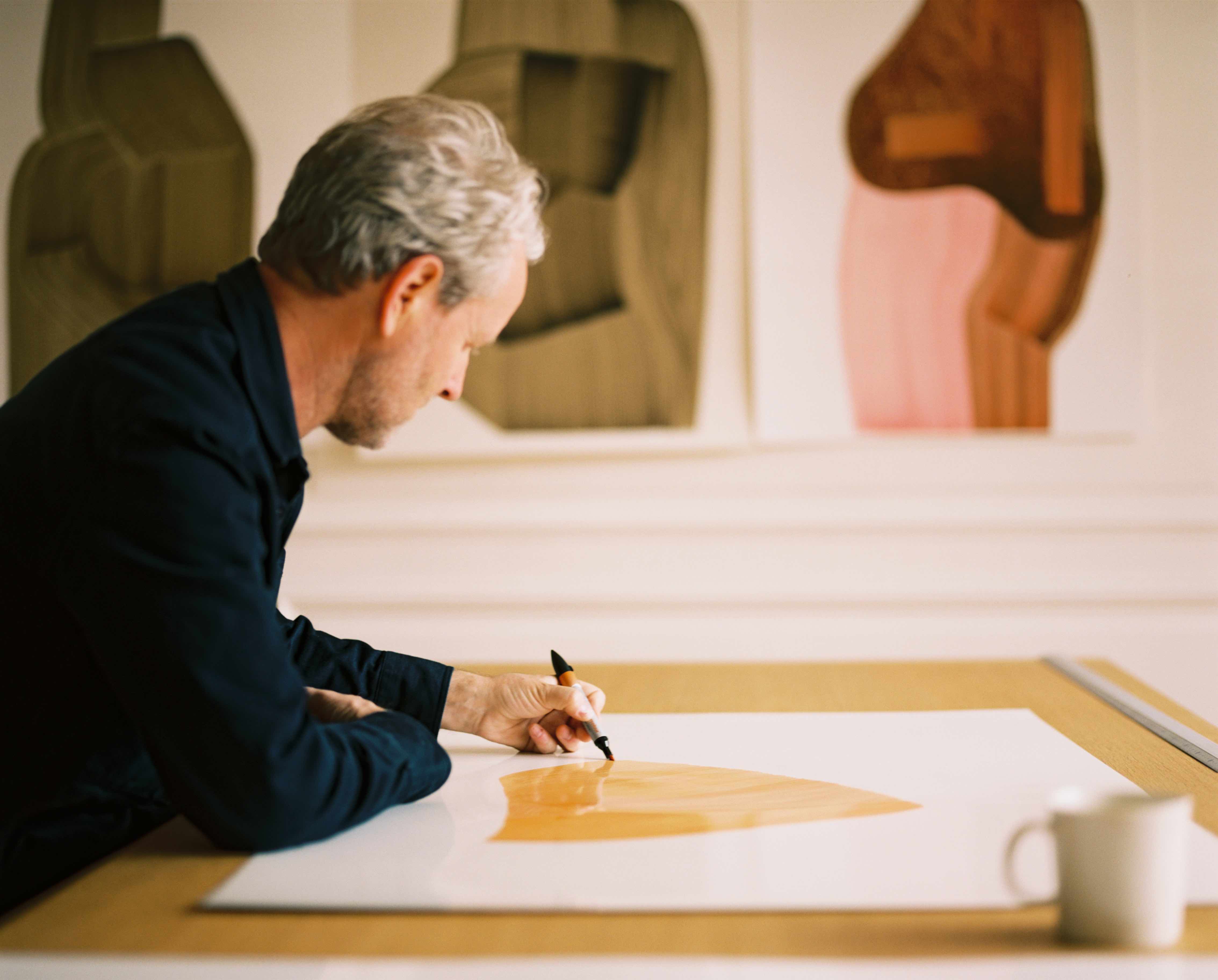 Dans cet endroit d’un blanc crème immaculé, à l’aménagement monacal, ses dessins, en cours ou achevés, sont scotchés aux murs ou jonchent le parquet aux côtés de boîtes d’archives en carton noir. Ronan Bouroullec a choisi pour atelier une pièce orientée plein sud, baignée de lumière, sans vis-à-vis. Là, sur une longue table en bois Passerelle – développée avec son frère pour l’éditeur Hay –, il dessine face au ciel parisien ses œuvres autonomes où l’on trouve malgré tout, note Martin Béthenod, « des parentés formelles avec son travail de designer comme la question des points de jonction, des modes d’assemblage, la manière dont les formes, les plans, les matériaux, se rencontrent, qui est aussi fondamentale dans ses objets ».